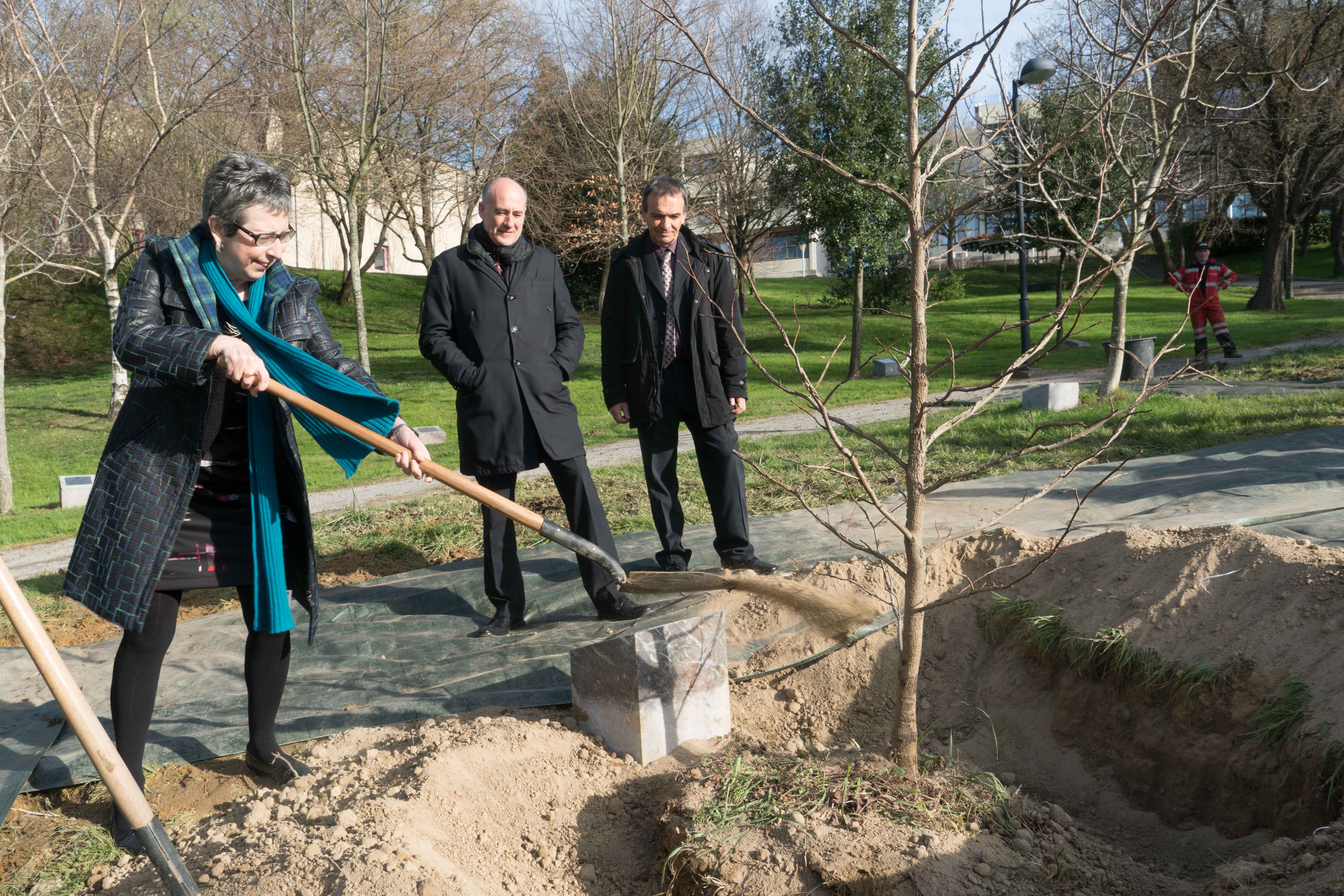 Mª Jesús Esteban plantando un roble americano en el Paseo de los Doctores Honoris Causa junto con Iñaki Goirizelaia y Javier Duoandikoetxea -