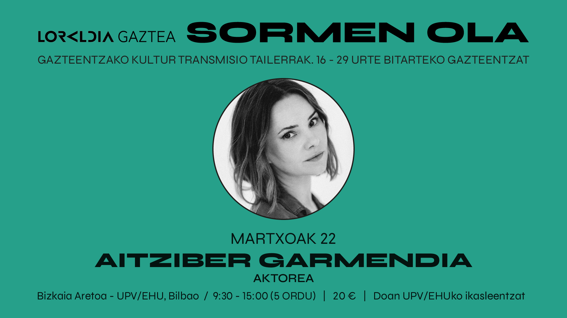 Nork ematen du tailerra: Aitziber Garmendia, aktorea eta umoregilea da. Zuzenbideko lizentziaduna. ETBrako egindako lanek famatu dute batik bat, telesailetan eta umore saioetan; baina antzerkian ere lan oparoa du.