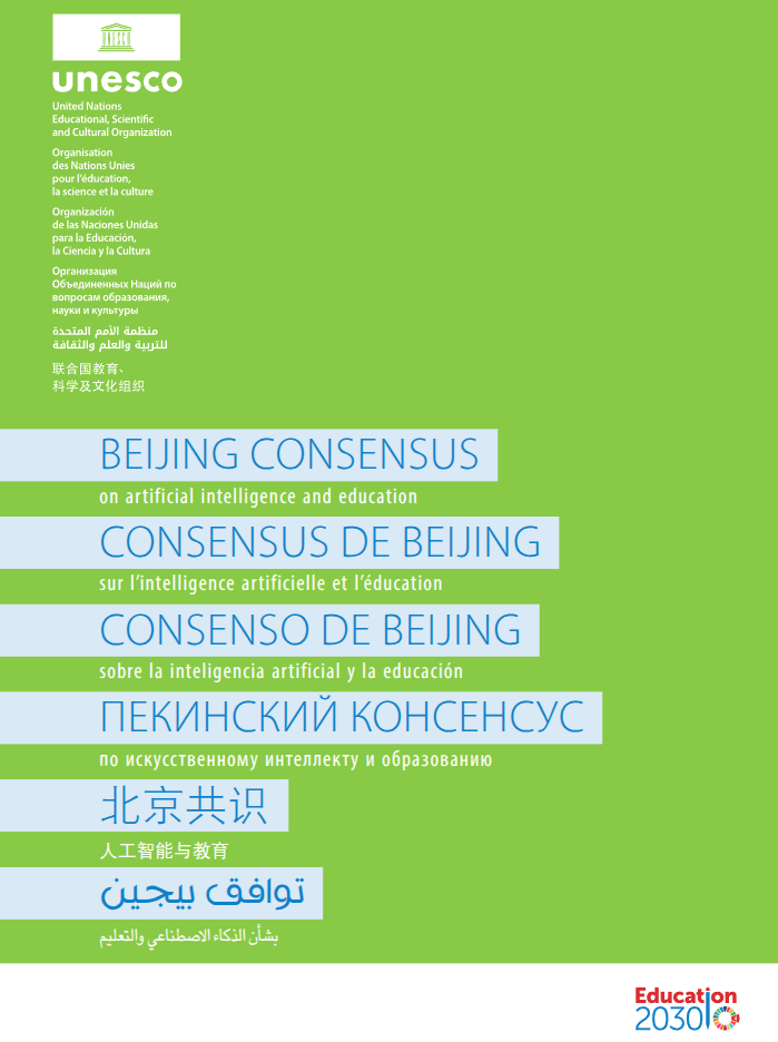UNESCOren Beijing Consensus on AI and Education dokumentuak Adimen Artifizialaren (AA) hezkuntzan aplikazio arduratsua eta bidezkoa bultzatzeko nazioarteko adostasun garrantzitsua ezartzen du. Kontsentsuak AAren potentziala aitortzen du —ikaskuntza pertsonalizatua, ebaluazio-sistemak hobetzea eta hezkuntza-kudeaketa eraginkorragoa— baina, aldi berean, arriskuak azpimarratzen ditu, hala nola pribatutasunaren urraketa, datuen gehiegizko erabilera edo diskriminazioa. Dokumentuak printzipio nagusiak proposatzen ditu: giza eskubideen errespetua, irisgarritasun eta ekitate handiagoa, gardentasuna, datuen babesa eta irakasleen gaitasunen indartzea. Halaber, herrialdeei hezkuntza-sistemetan AAren erabilera gobernatzeko marko sendoak garatzeko gomendatzen die, eta komunitate osoaren —ikasleak, irakasleak, administrazioak eta gurasoak— parte-hartzea sustatzen du. Kontsentsu honek mundu mailako orientazio esanguratsua eskaintzen du hezkuntzan AA fidagarri, etiko eta gizarte-ongizatean oinarritua garatzeko.