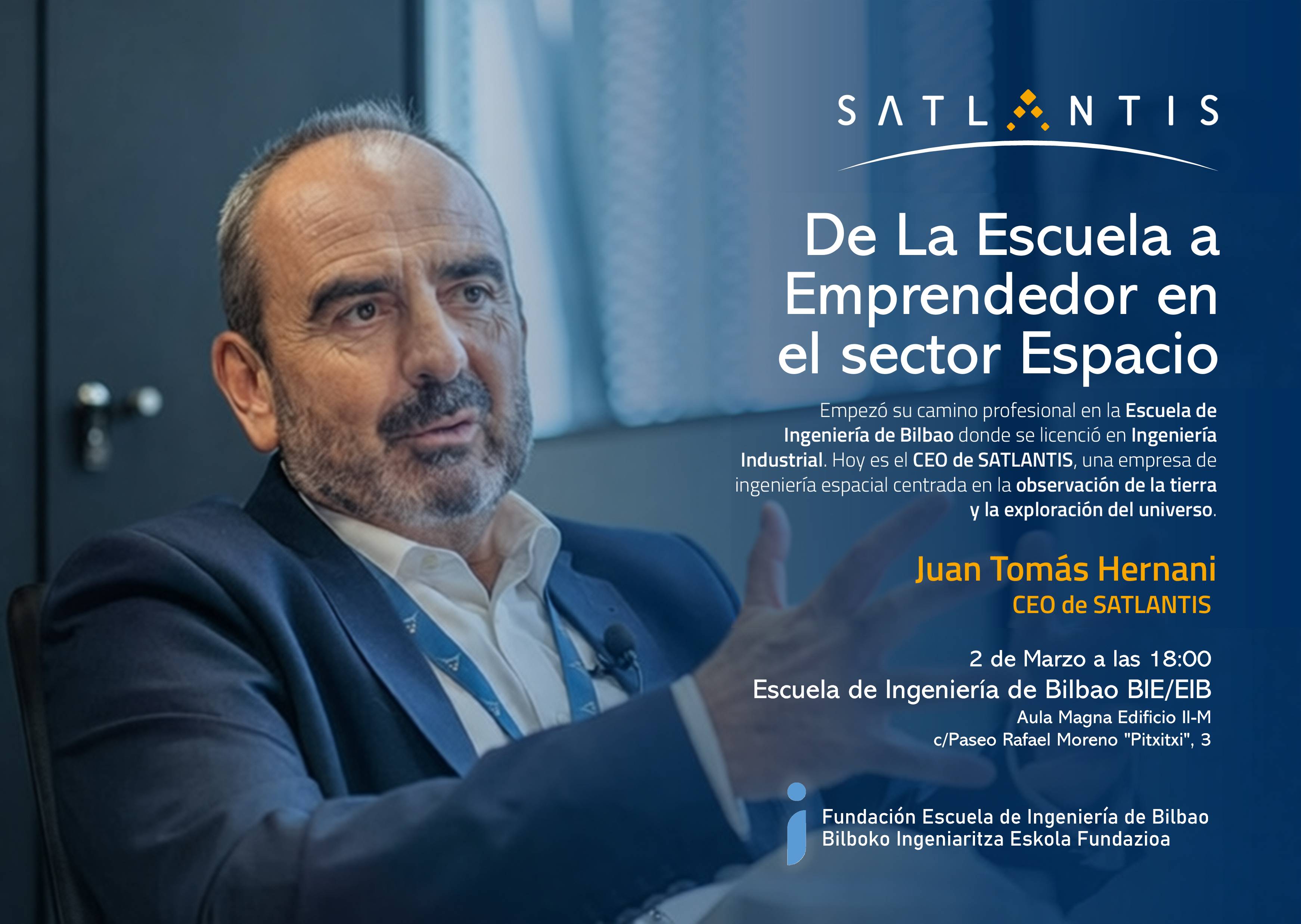 Datorren astelehenean, martxoaren 2an, 18:00etan, Juan Tomás Hernani, SATLANTIS-eko CEO, izango dugu Eskolan. Bere ibilbidea azalduko digu, eta sateliteen egungo teknologia aplikazio anitzetan nola aplikatzen den azalduko digu, arlo zientifikotik hasi eta industrialera arte.