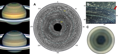 2. irudia. Ezkerrean: Saturno Calar Altoko Behatokiko 1.23 m-ko eta 2.2 m-ko teleskopioetako PlanetCam eta Astralux kameren bidez 2013an hartutako irudietan. Hexagonoak eskualde ilunaren ertza osatzen du iparraldeko poloan. Kreditua: UPV/EHUko Zientzia Planetarioen Taldea. Eskuinean: Saturnoko iparraldeko poloaren mapak, hexagono-formako egitura erakusten dutenak: (A) Cassini ISS (2009ko urtarrilaren 3a); (B) Hexagonoaren barnealdeko hodeien xehetasuna (Cassini ISS, 2008ko abuztuaren 26a); (C) Calar Altoko Behatokiko 2.2 m-ko teleskopioa: Astralux kamera (2013ko uztailaren 13a-16a) Kreditua: UPV/EHUko Zientzia Planetarioen Taldea-NASA/ESAren Cassini.