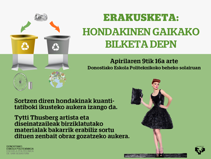 Asteazkenean, apirilaren 9an, 12.30tan, Donostiako UPV/EHUko Unibertsitate Eskola Politeknikoko beheko solairuan dagoen erakusketa gunean, "Hondakinen gaikako bilketa DUEPn" erakusketa aurkeztuko da. Honen helburua da aipatutako ikastegiko komunitatea birziklatzearen inguruan kontzientziatzea eta zalantzak argitzea (zer / non bota). Horretarako, aipatutako unibertsitate eskolak birziklatzeko ematen dituen aukerak eta hondakin bakoitza non bota behar den azaltzeaz gain, sortzen diren hondakinak kuantitatiboki ikusteko aukera izango da. Gainera, birziklatzen diren materialek ematen dituzten aukerak ikusi ahal izango da. Helburu horrekin, Tytti Thusberg artista eta diseinatzaileak birziklatutako materialak bakarrik erabiliz sortu dituen zenbait obraz gozatzeko aukera izango dute bertaratuak apirilaren 16a arte.