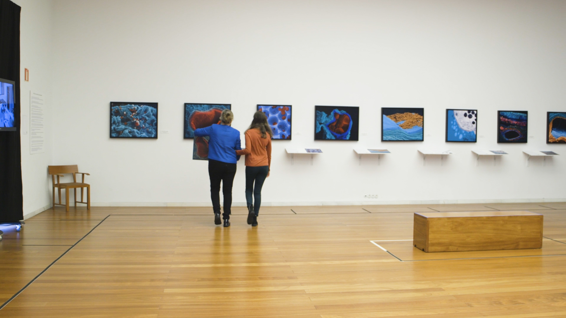 Erakusketan bildutako argazkiak handipen handiko mikroskopioekin eginda daude, balearen begiko zati txiki-txikiak zehaztasunez ikusten uzten dutenak, eta, tamaina errealean gizakiak eta baleak oso ezberdinak garen arren, txikian oso antzekoak garela erakusten dute. “Tamaina erreala eta mikroskopikoa alderatzeko ariketa egin nahi nuen”, azaldu du Vecinok.