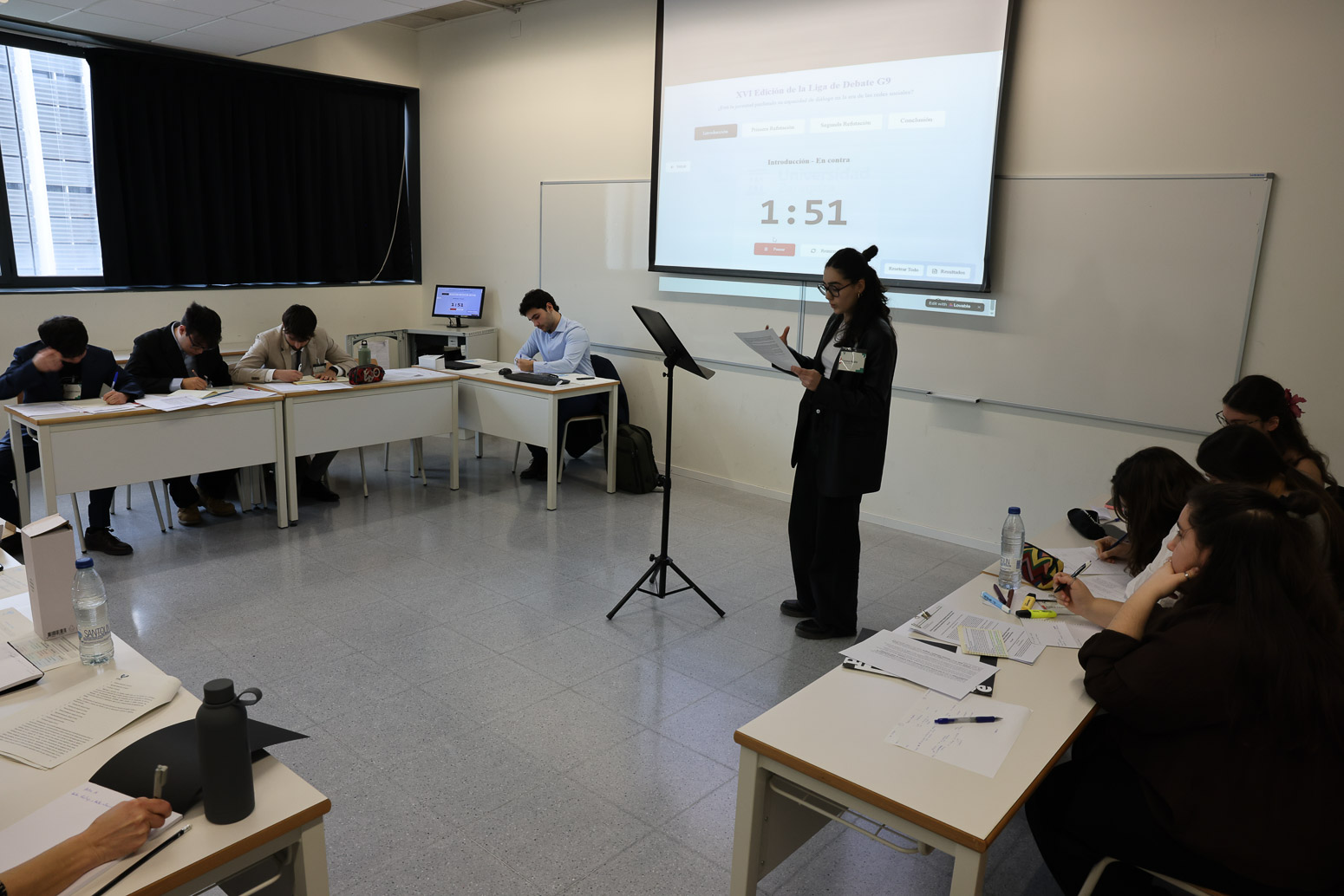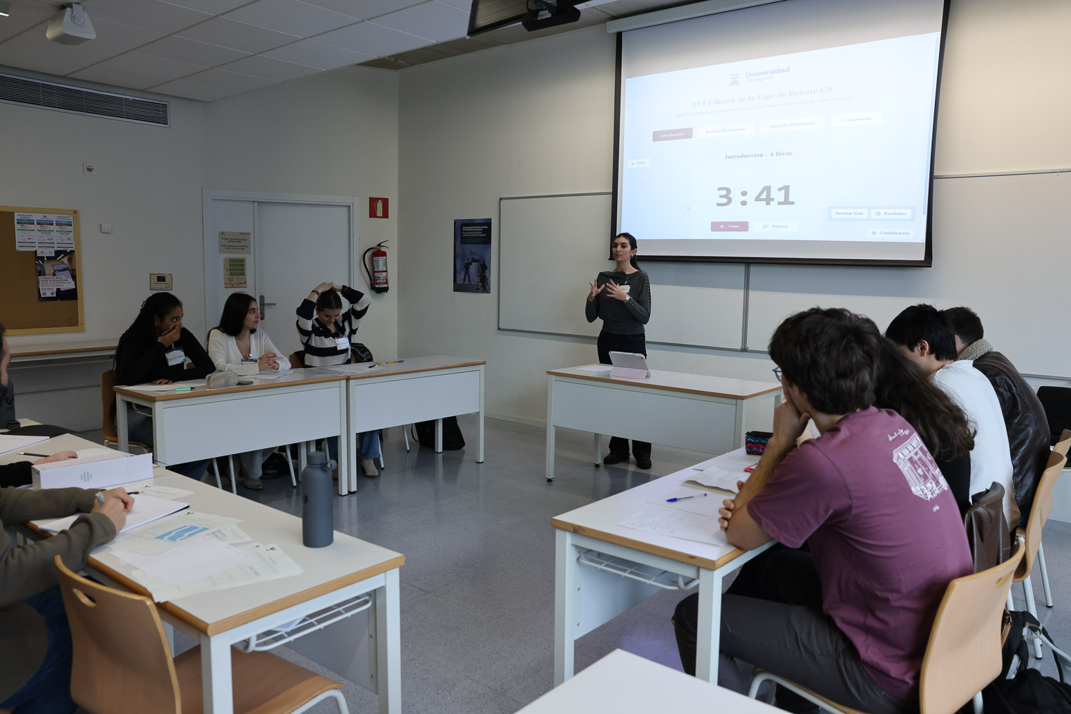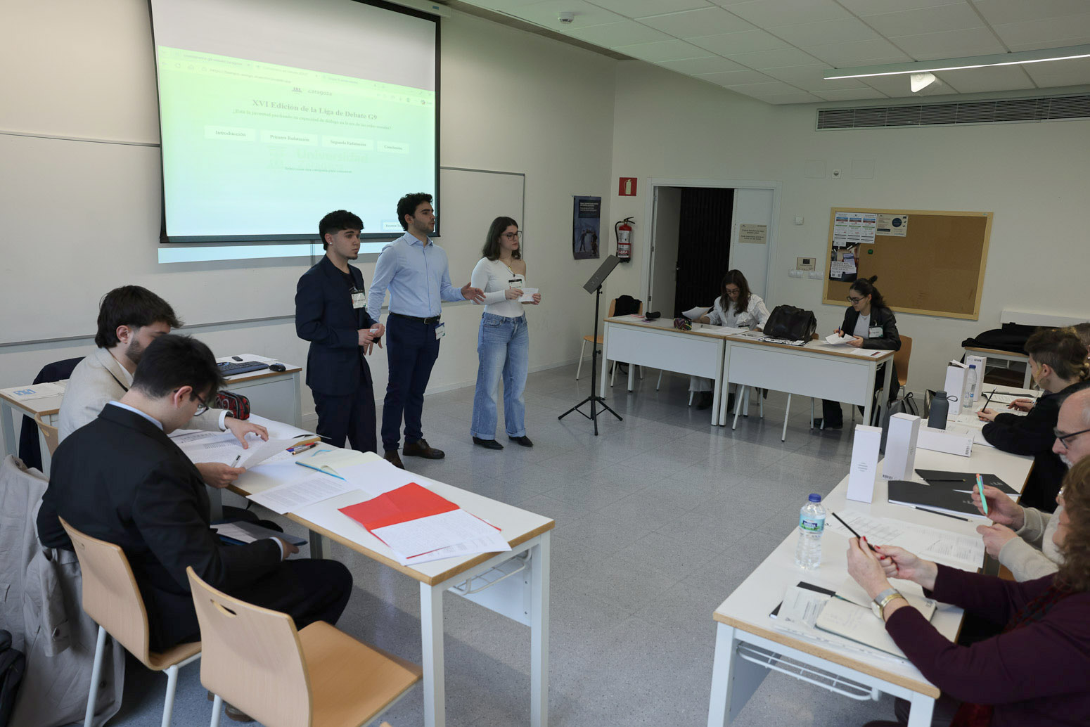 Fisika, Zuzenbidea, Soziologia, Filosofia, Ingeniaritza eta Haur Hezkuntza bezalako gradu ezberdinetako 22 ikaslek gaurkotasun handiko galdera bati egin zioten aurre: Gazteak elkarrizketarako gaitasuna galtzen ari al dira sare sozialen garaian? Bost taldetan antolatuta —Sin notificaciones, Lógica en redes, Nexo, Hefistak eta Tsunami Atómico—, parte-hartzaileek zozketa bidez minutu batzuk lehenago esleitzen zitzaizkien jarrerak defendatu zituzten eztabaida bakoitzean. Sarrera, errefutazioa eta ondorioa izan ziren jardunaldiaren ardatzak; baina argudioez gain, intonazioak, segurtasunak eta konbentzitzeko gaitasunak ere pisu handia izan zuten. Izan ere, eztabaidatzea ez da soilik hitz egitea: konbentzitzea da. Lau kanporaketa eta final baten ondoren, ‘Sin notificaciones’ taldeak gainerako taldeak gainditu zituen eta EHU ordezkatuko du Zaragozan.