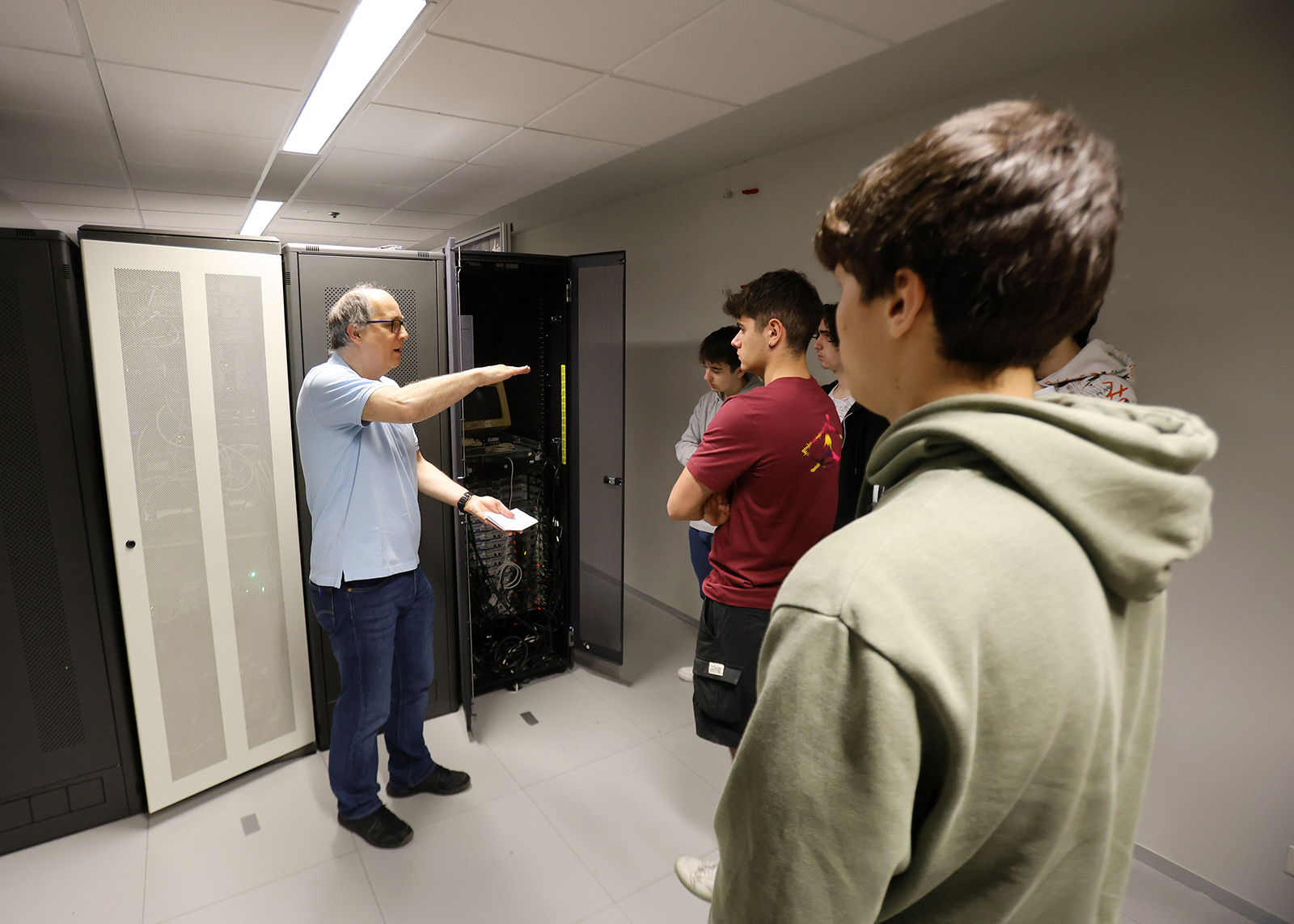 “Datuak Prozesatzeko Zentroa (DPZ) – azaldu du Liborio Revillak – ekipamendu informatikoa hartzeko bereziki prestatutako gela da: ordenagailuak eta komunikazioak. Gela hauek tenperatura- eta hezetasun-baldintza konstanteak mantentzeko prestatuta daude. Era berean, etengabe elikatzeko sistemen eta multzo elektrogenoen bidez, etengabe elektrizitatea hornitzeko prestatuta daude.” Gipuzkoako Campuseko Proiektuen Arloko buru eta IKT koordinatzailearentzat bisita mota hauek oso positiboak dira. Liborio Revillak azpimarratu duenez, “interesgarria iruditzen zait informatikaren arloko etorkizuneko langileek beren lan-bizitza hasten dutenean agian toki horretan bertan lan egitea.”