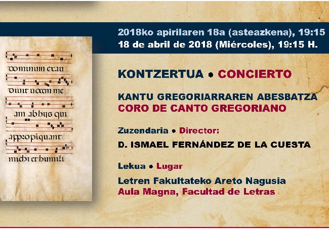 Asteazkenean, apirilaren 18an, 19:15etan Universidad del País Vasco/Euskal Herriko Unibertsitatearen Letren Fakultateko Areto Nagusian kontzertu bat programatu da ‘The Gregorian Chant Choir of Spain’ gregoriar kanturako koruak emango duena Ismael Fernández de la Cuestak zuzenduta, UPV/EHUren Arabako campuseko Esperientzia Gelek eta ACAEXA-AEIKE Arabako Esperientzia Geletako ikasle eta ikasle ohien elkarteak antolatuta.