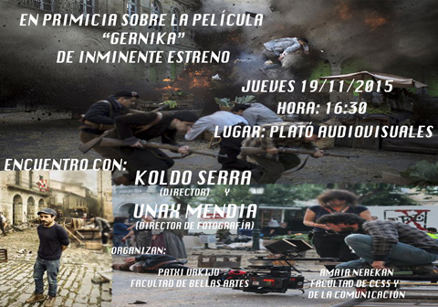 Ostegunean, azaroak 19, 16:30ean, Arte Ederretako II Eraikinean, Ikus-entzunezko platoan, (Sarriena Auzoa, z/g. Leioa) topaketa batean parte hartuko dute Koldo Serrak, gertu estreinatuko den ‘Gernika' filmaren zuzendariak, eta Unax Mendiak, filmaren argazki-zuzendariak.