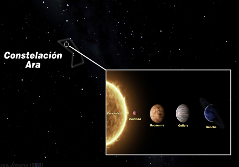 Iragan abenduan, guregandik 49,8 argi-urtera dagoen izar azpi-erraldoi batek Cervantes-en izena darama. Ara konstelazioan dauden zeruko gorputz horren inguruan biratzen dira Kixote, Rozinante, Dulzinea eta Santxo, planeten sistema berria osatzen duten lau exoplanetak.