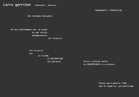 Arabar campuseko Unibertsitate Pabiloiko erakusketa aretoan (Apraiztarrak, 1. 01006 Vitoria/Gasteiz) azaroaren 2 eta 30en artean AR-LA kolektiboaren erakusketa jarriko da ‘Larru gorritan. Nos sentimos desnudos, solos' izenarekin.