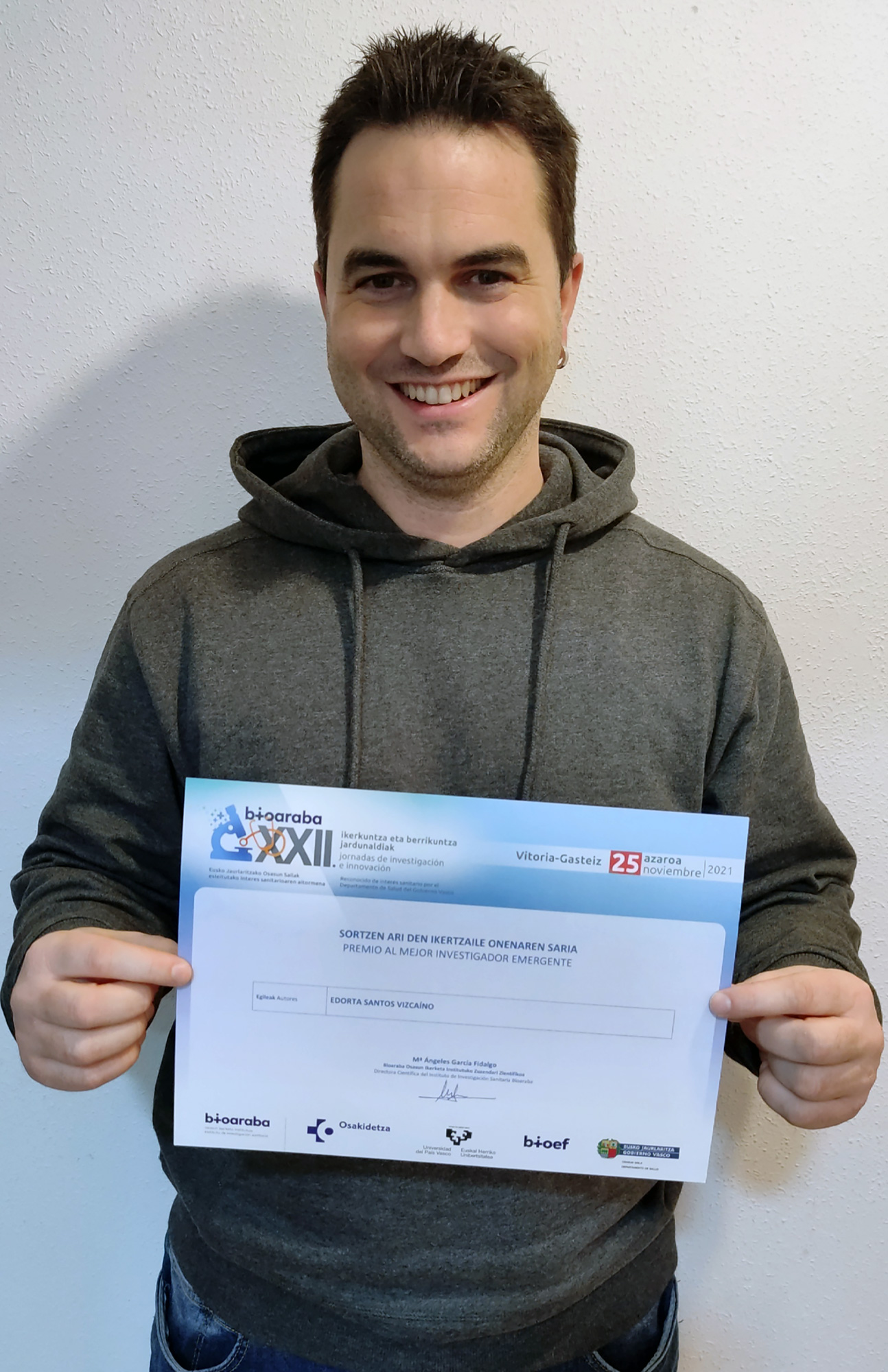 Edorta Santos Vizcaíno ikertzaile eta Universidad del País Vasco/Euskal Herriko Unibertsitateko irakasleak Ikertzaile Berri Onenaren saria jaso zuen Bioaraba Osasun Ikerketa Institutuaren eskutik, joan den azaroan, Ikerketa eta Berrikuntzako XXII. Jardunaldietan. Arabako Osasun Sareko (ARABAKO UNIBERTSITATE OSPITALEA-ARABAKO ESIa/BIOARABA) edozein zentro publikotan ikerkuntzan ari diren 40 urtetik beherako ikertzaileen lana aitortzen du sari horrek. Saria emateko irizpideen artean, honako alderdi hauek baloratzen dira: egindako ikerketaren kalitatea, ikerketa publiko eta pribatuko proiektuetan aktiboki parte hartzea, ikerketa biomedikoko lerroarekiko leialtasuna eta garatutako ikerketak ingurunerako dituen erabilgarritasuna eta interesa. Gainera, saritutako pertsonaren ikerketa karrera sustatzen jarraitzeko diru hornidura bat dakar.