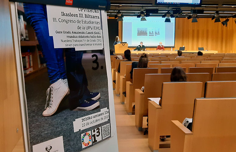 Gaur Ikasleen III. Kongresua egin dugu. 80 ikaslek baino gehiagok aurkeztu dituzte Nazio Batuen Garapen Iraunkorreko Helburuekin lotutako Gradu Amaierako Lanak. Egoerak agintzen duen bezala, ezinbesteko presentzia fisikoa baino ez du izan (ikasleak eta epaimahaia soilik), baina modu birtualean ere jarraitu ahal izan da.
