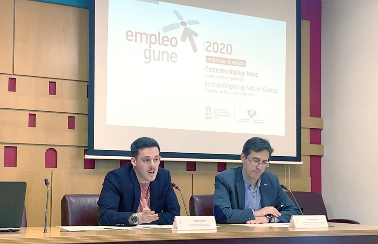 Enplegu eta Prestakuntzako zinegotzi Igor Salazarrek eta Euskal Herriko Unibertsitateko Arabako Campuseko errektoreorde Ivan Igartuak aurkeztu dute Enplegu Gune 2020 jardunaldia. Jardunaldi horren helburua da enplegu-eskatzaileen edo beren lan-egoera hobetu nahi duten pertsonen arteko topaketa eta ezagutza bultzatzea, bai eta beren plantilletan langileak sartu behar dituzten eta udalerriko langabeen eskura dauden enpresa publiko eta pribatuen artekoa ere. Lanpostu bat lortzeko aukerak hobetzen lagunduko dieten zerbitzuak eta baliabideak, bai eta lanpostu horretan espezializatutako tresnak ere.