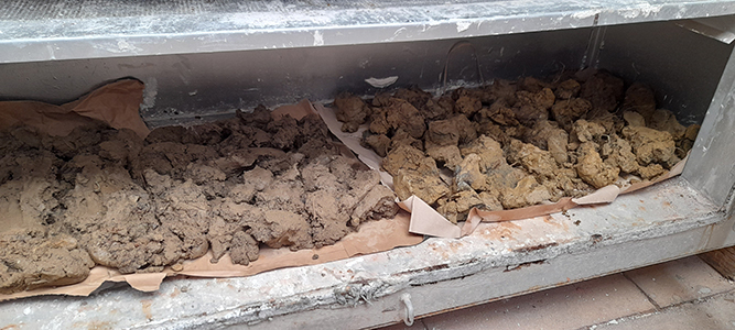 Hainbat buztin ikertzen hasi zen Larzabal, eta Arabako Elosun dagoen Ollerietako Euskal Buztingintzaren Museora iritsi zen horrela. Blanka Gomez de Segura adituarekin aritu zen bertan lanean, zeinak buztin mota ezberdinei buruzko irakaspenak eman zizkion eta GRALerako piezak sortzeko prozesuaren hainbat alderditan lagundu zion. “Blanka Gomez de Seguraren ekarpenekin, euskal zeramika tradizionalari, inspiraziotzat hartuta, ukitu moderno bat eman nahi izan nion”, zehazten du.