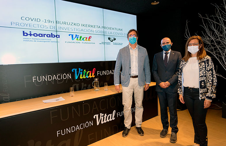 Vital Fundazioak COVID-19ri buruzko hamalau ikerketa-proiektu jarriko ditu abian, Bioaraba Osasun Ikerketarako Institutuarekin eta Euskal Herriko Unibertsitatearekin (UPV/EHU) elkarlanean. Proiektu horien garapena Arabako gizartean pandemiak dituen ondorioak arintzeko Vital Fundazioak apirilean egindako ezohiko deialdiaren barruan kokatu da. Bi erakundeek 312.000 euro jasoko dituzte guztira, aipatutako lan horiek garatzeko. Axier Urresti Vital Fundazioetako zuzendari exekutiboak, Mª Angeles Garcia Bioaraba Osasun Ikerketarako Institutuko zuzendari zientifikoak eta Ivan Igartua UPV/EHUko Arabako Campuseko errektoreordeak aurkeztu dituzte proiektuak, prentsaurreko batean.