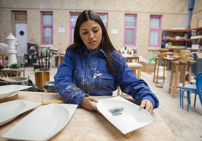 Paola Álvarez, UPV/EHUn diseinuan graduatua, jada matrikulatu da Zeramika: Artea eta Funtzioa masterrean, eta datorren urtean berriro arituko da Arte Ederren Fakultateko lantegian. “Ikaskideok oso harreman ona dugu. Askotan elkarrekin lan egin behar dugu, esate baterako labea erabiltzeko. Gainera, pieza bat apurtzen denean eta berriro hasi behar denean sortzen den estresa kudeatzen ikasten duzu. Lana etxera eraman ezin denez gero, ordu asko ematen dugu elkarrekin”.