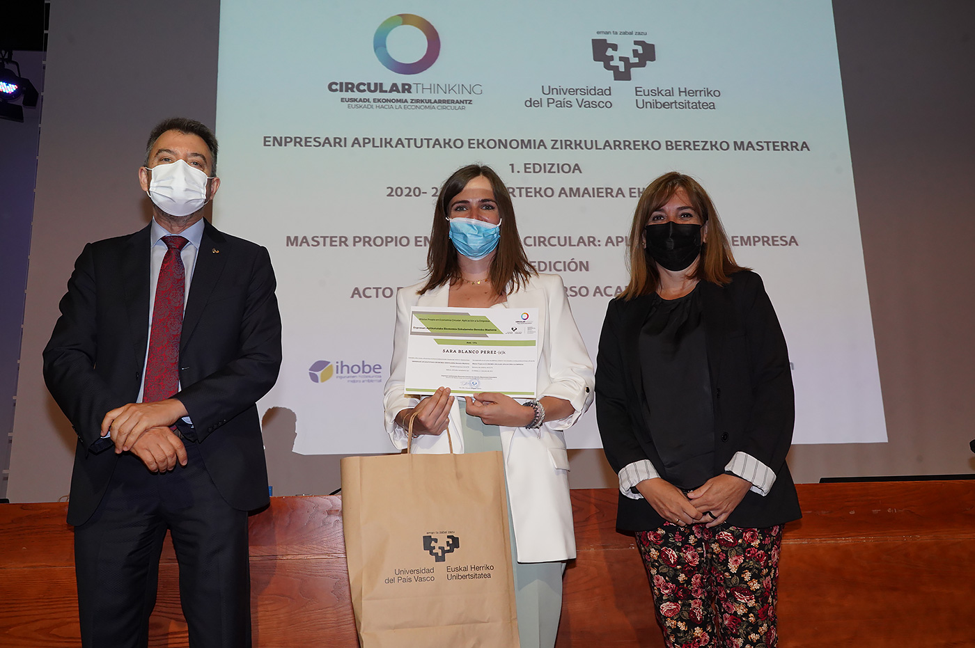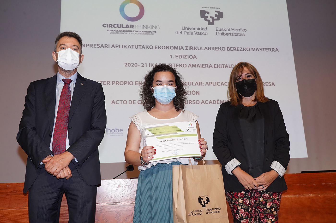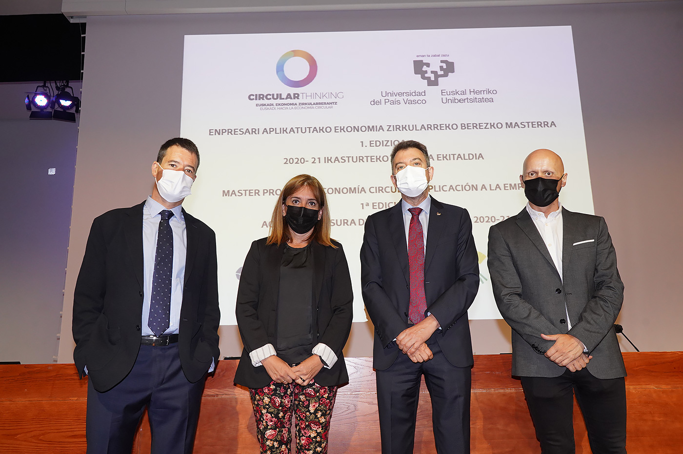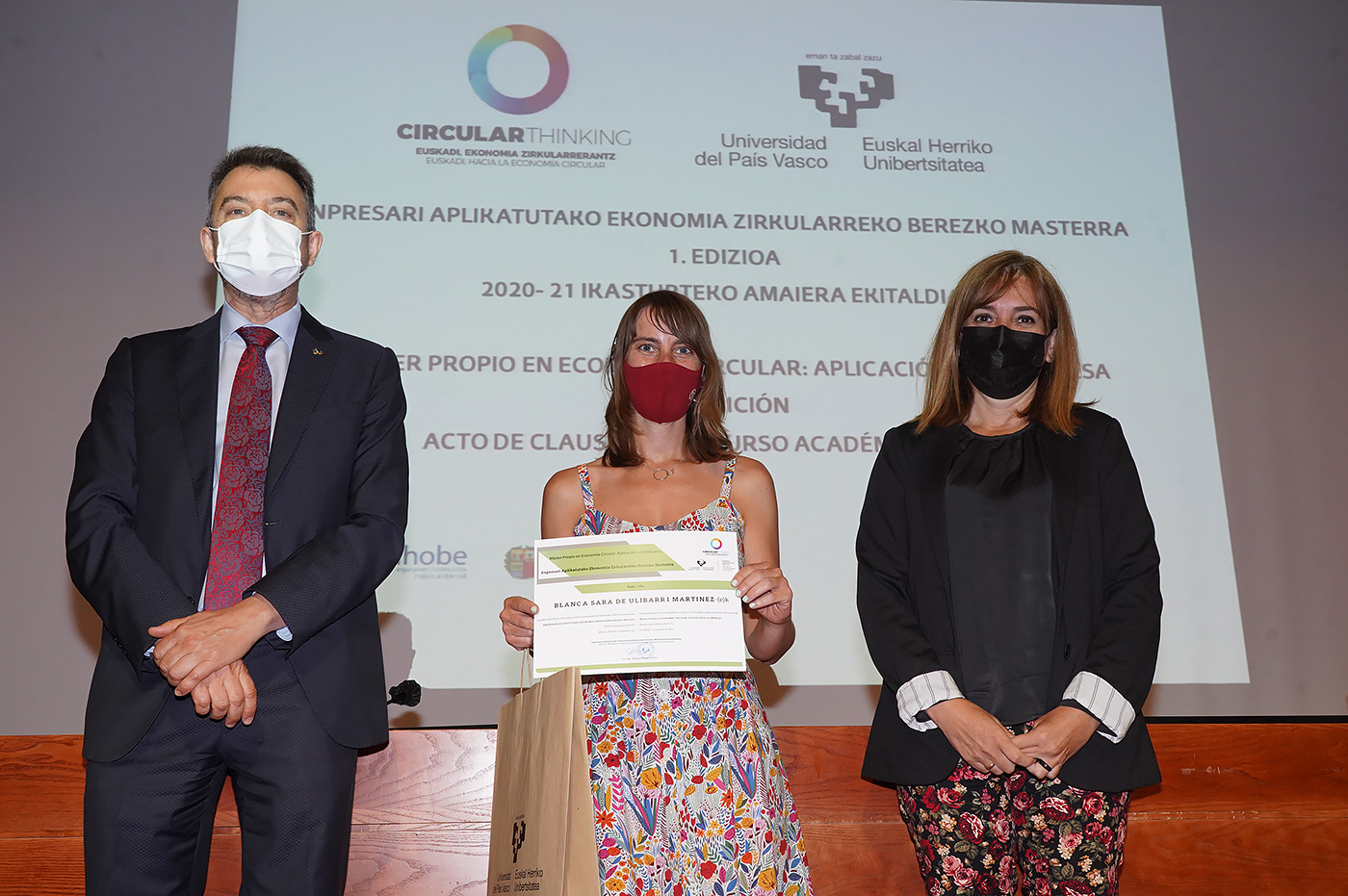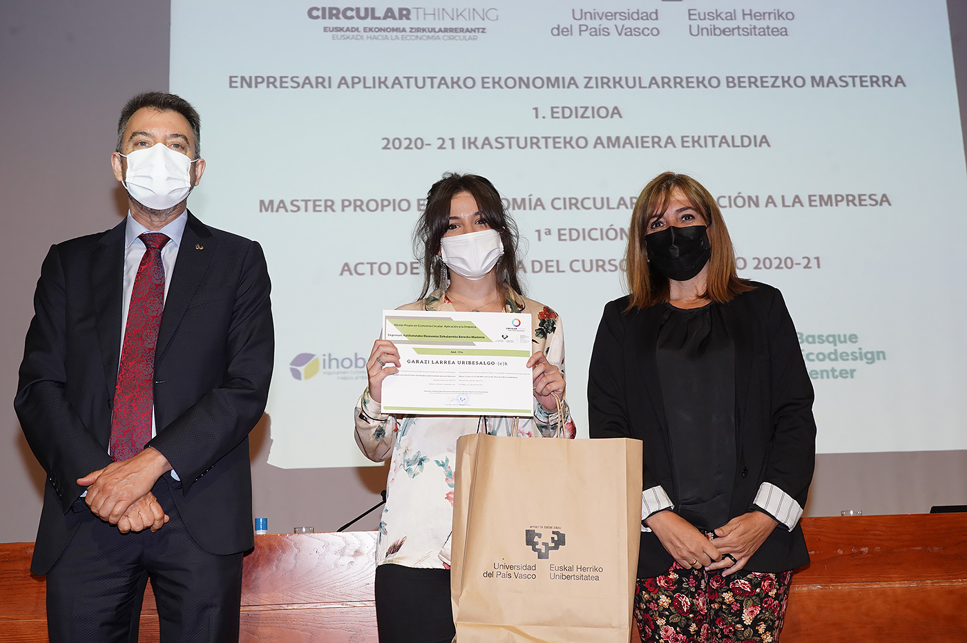 Bizkaia Aretoaren Mitxelena Auditorioan egin den ekitaldian, hitza hartu dute, besteak beste, Amaia Barredo Eusko Jaurlaritzako Ekonomiaren Garapen, Jasangarritasun eta Ingurumen saileko Ingurumen Jasangarritasuneko sailburuordeak, Guillermo Quindós UPV/EHUko Zientzia eta Gizarte Garapenaren eta Transferentziaren arloko errektoreordeak, José María Fernández Alcalá IHOBE Ingurumen Kudeaketako sozietate publikoaren Ekonomia Zirkularreko zuzendariak eta Rikardo Minguez masterraren zuzendariak.