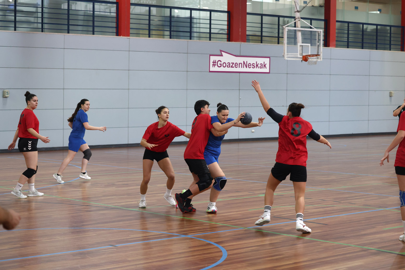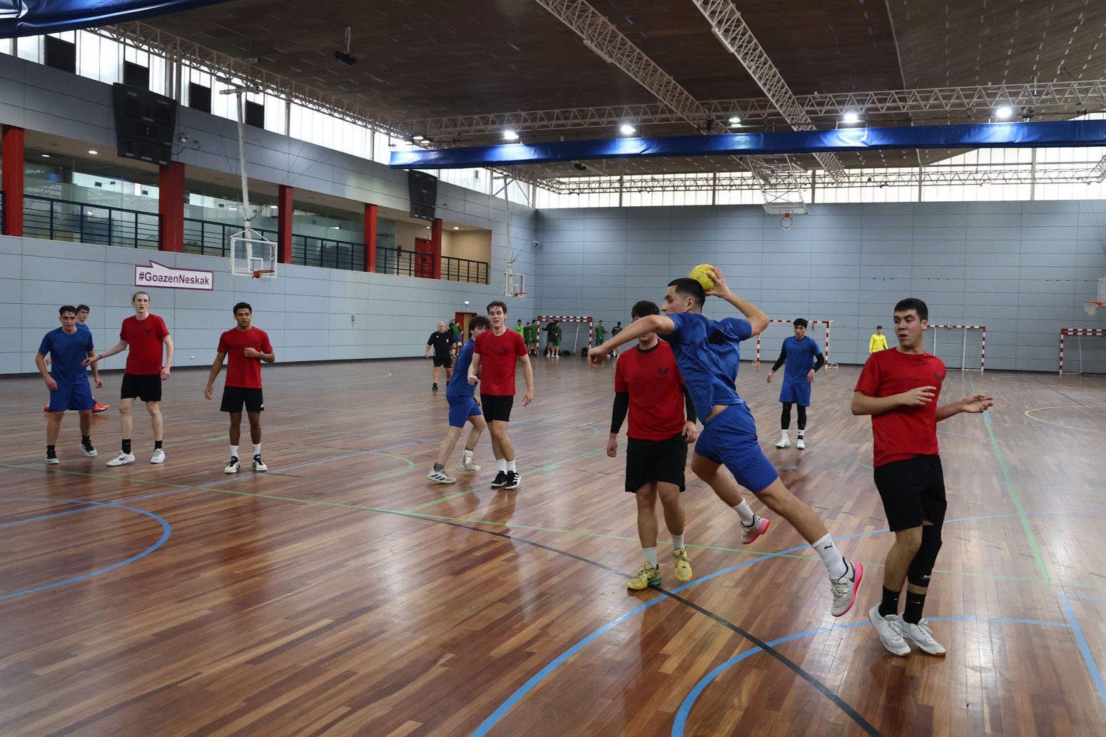 Marea gorri, berde eta urdin batek Donostiako hainbat kirol egoitza zeharkatu zituen atzo. EHUko hiru campusetako bostehun ikasle baino gehiago Euskadiko Txapelketarako plaza bat jokatzen ari dira. Kirol-izpirituak hiria zeharkatzen du.