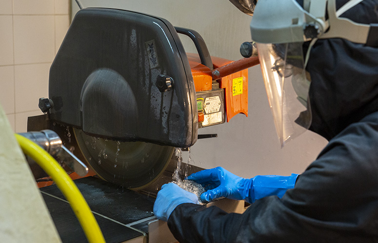 Diamantezko diskoaz haitz laginak mozten, xafla meheak prestatzeko laborategian. Argazkia: Fernando Casabella. UPV/EHU -