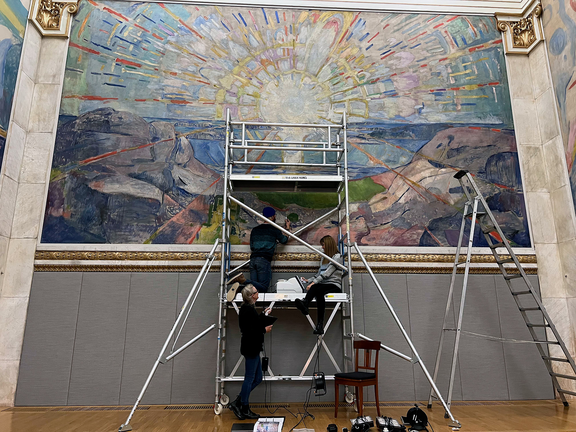 Maite Maguregui irakasleak Osloko Unibertsitateko Areto Nagusiko pinturak aztertzen laguntzen du, zeinak 1916an Edvard Munchek, Garrasia artelan ospetsuaren egileak, margotu zituen.