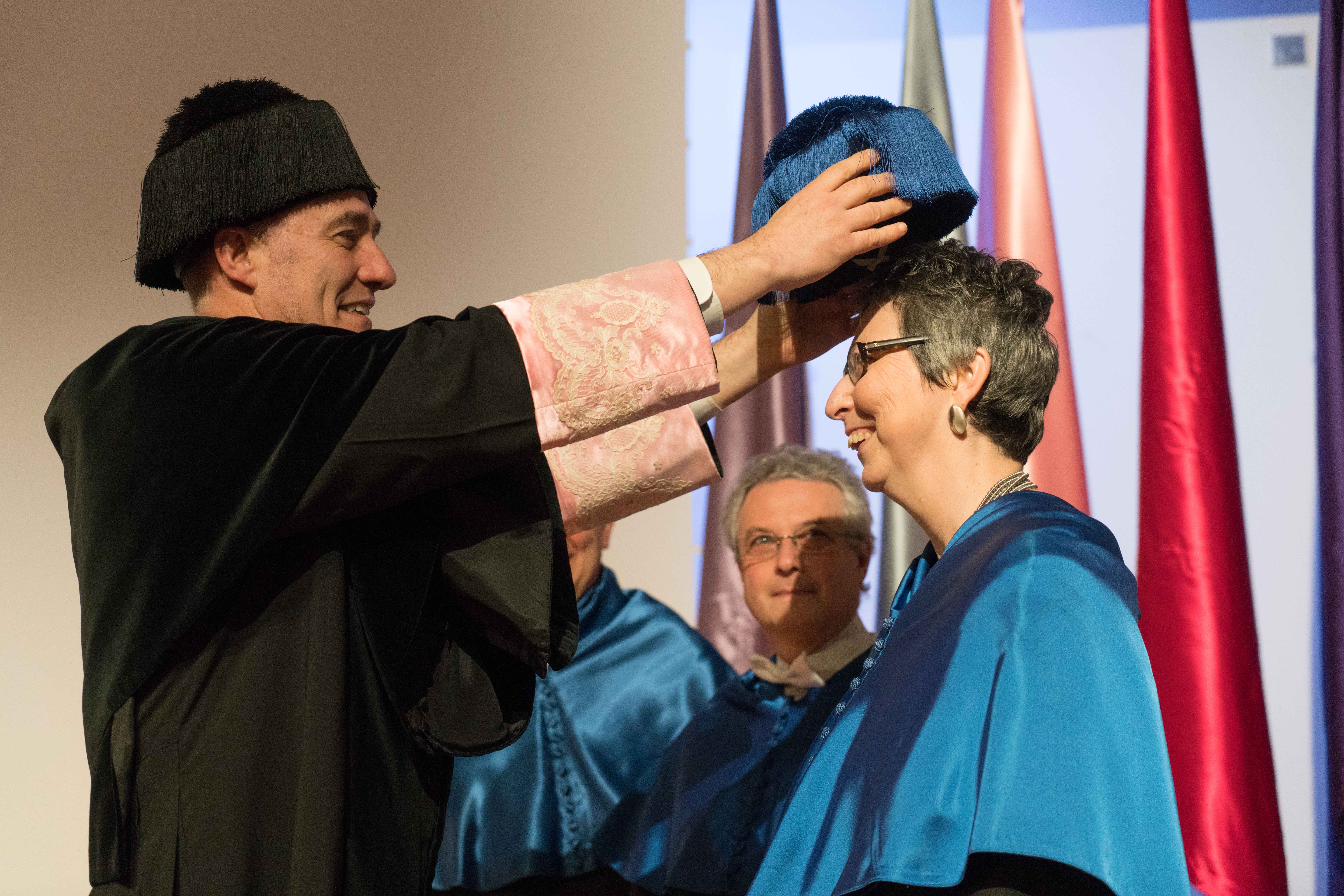 María Jesús Esteban erramu birreta jasotzen Iñaki Goirizelaia errektorearen eskuetatik -