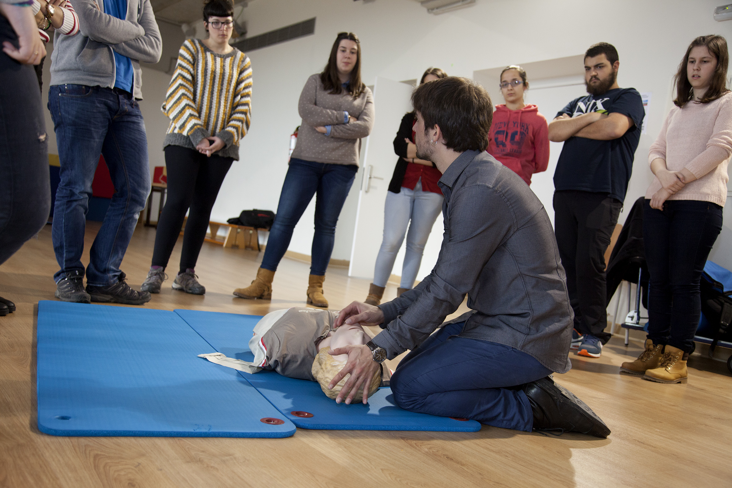 Azalpen teorikoen ondoren, praktikak heldu dira. Hala, Bilboko Irakasleen Eskolako gimnasioan, etorkizuneko maistrak eta maisuak erreanimatze lanak egiten hasi dira, baita zauriak zaintzen eta eztarriko trabamendu bati aurre egiten ere.