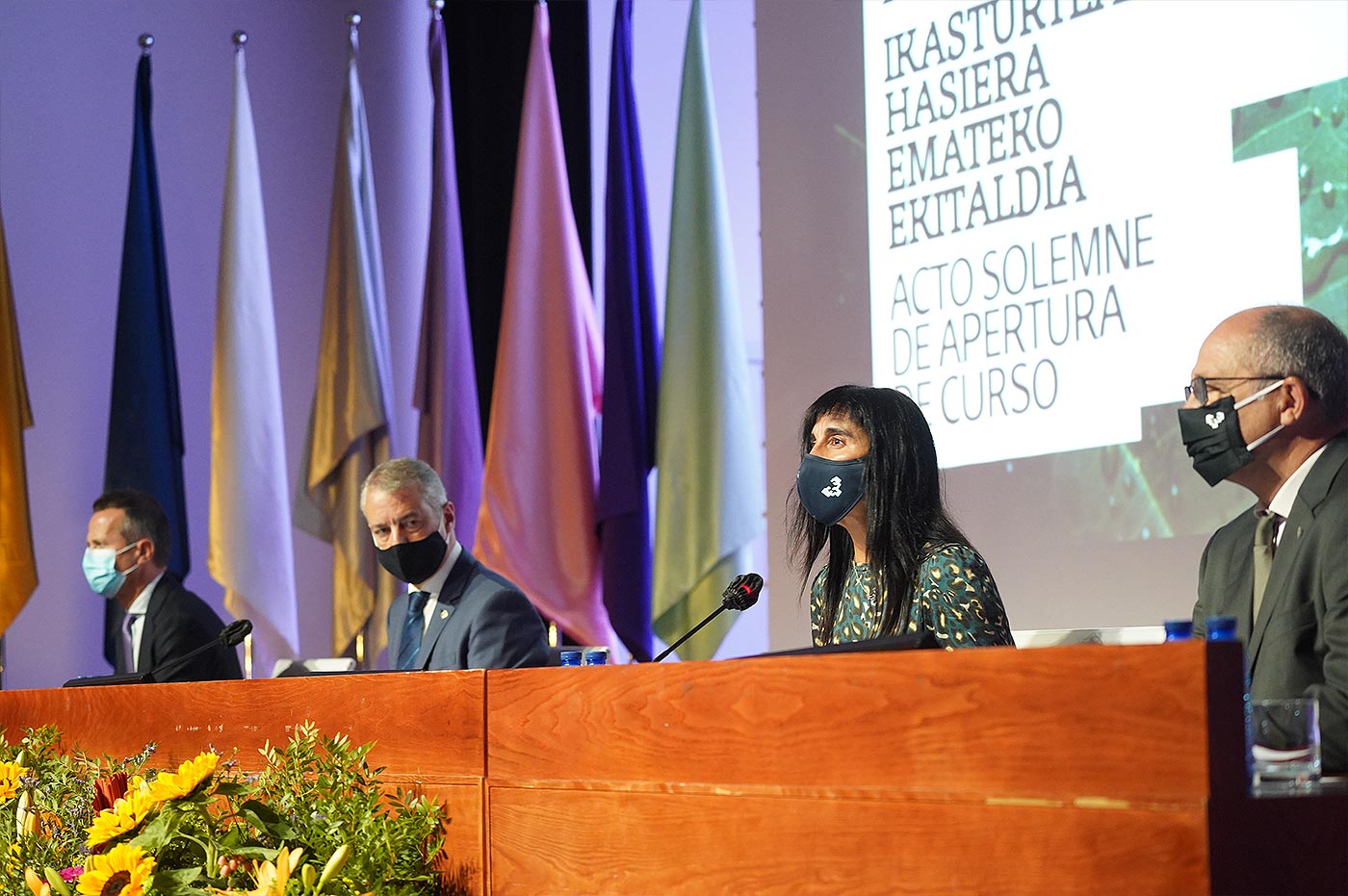 La rectora ha dedicado después parte de su intervención a la pandemia del coronavirus y su repercusión en la universidad pública vasca. Junto a la exposición sumaria de las medidas de protección adoptadas y de las establecidas, ya desde el curso pasado, para la normal impartición de la docencia, ha destacado el gran trabajo desarrollado: “el periodo de confinamiento ha supuesto un sobreesfuerzo intenso y generoso por parte de toda la comunidad universitaria: alumnado, personal docente e investigador, y personal de administración y servicios. (…) Todo podría haberse hecho mejor, también el equipo rectoral podría haberlo hecho mejor, pero la voluntad y la energía de la comunidad universitaria han sido notables y quiero reconocerlo y agradecerlo públicamente. Hemos desarrollado la potencialidad de nuestros recursos telemáticos y, a su vez, aprendiendo a valorar, ahora que faltaba, la educación presencial. En este punto quiero agradecer al Gobierno Vasco el inestimable apoyo que nos ha brindado para adaptar nuestra docencia a esta difícil situación. Y reconocer la valiosa labor de apoyo y acompañamiento que se ha realizado desde el Ministerio”.