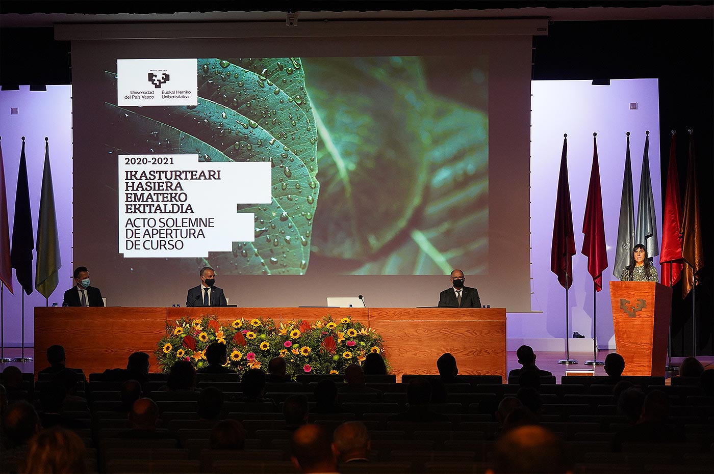 Un saldo claramente positivo es el que ha expuesto hoy la rectora de la Universidad del País Vasco/Euskal Herriko Unibertsitatea en el acto solemne de apertura del curso académico 2020-2021 que ha tenido lugar en Bizkaia Aretoa, en Bilbao, y que se ha retransmitido a los tres campus, donde se seguía su desarrollo vía streaming.