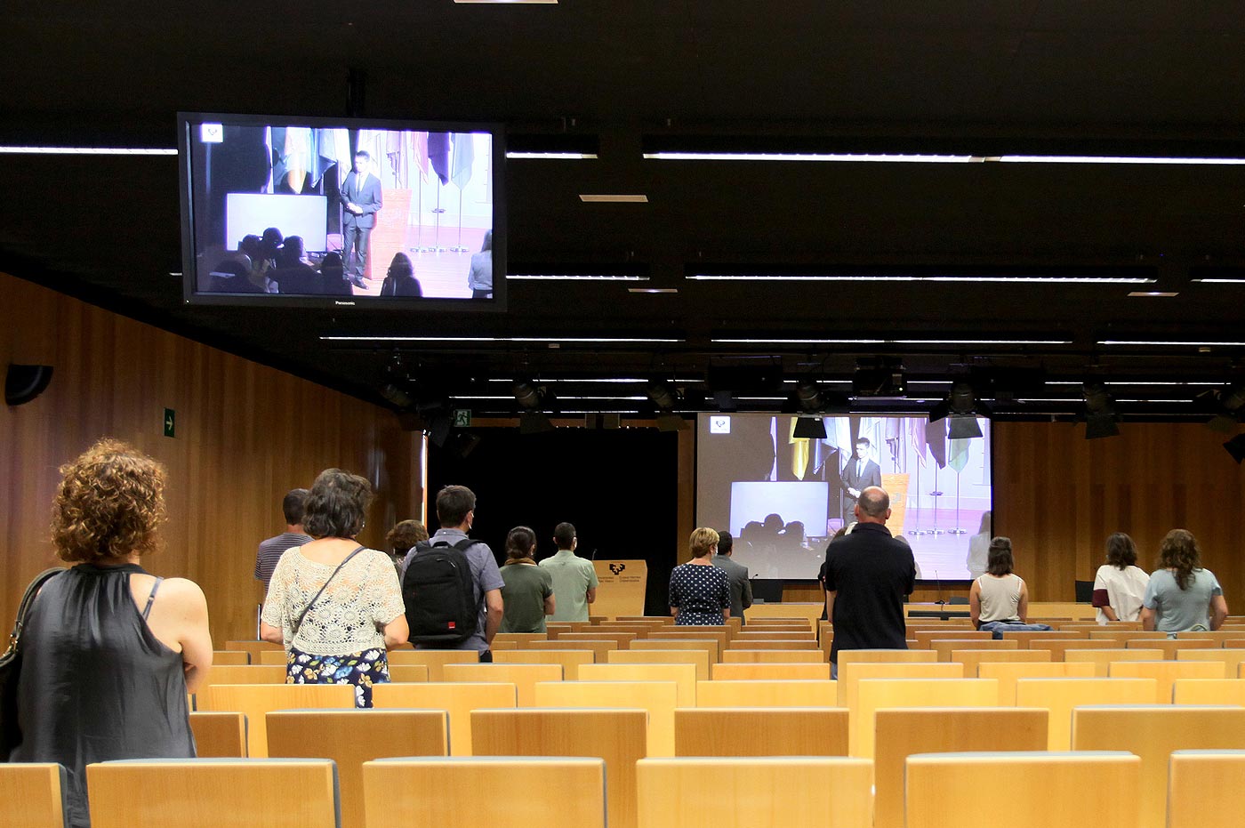 Carlos Santamaria Zentroan ekitaldia jarraitu duen publikoa zutik. Argazkia: Nagore Iraola / UPV/EHU -
