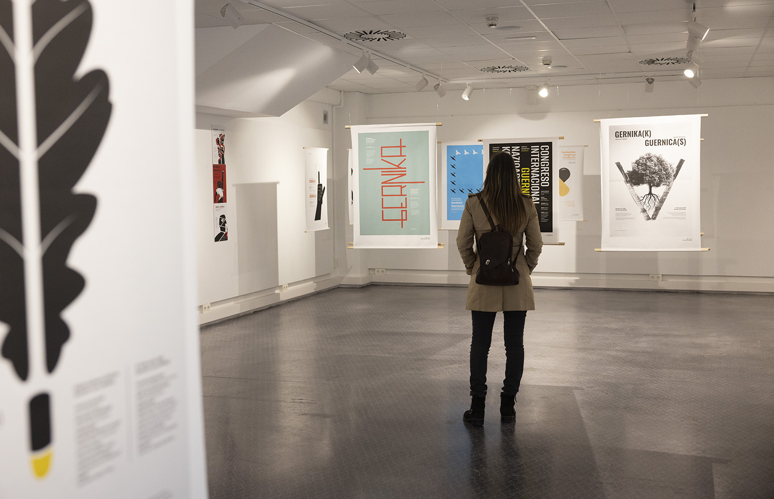 Emakumeak Guernica izan zenaren eta inoiz izan behar izan ez zuenaren isla ikusten du. Zutik, Arte Ederren Fakultateko Sorkuntza eta Diseinuko Graduko ikasleek ‘Gernika (k)/`Guernica (s). Trauma historiko baten erresemantizazioak’ kongresurako, datorren ekainean bakearen ikur den herri honetan ospatuko den ekitaldirako, egindako kartelen aurrean.