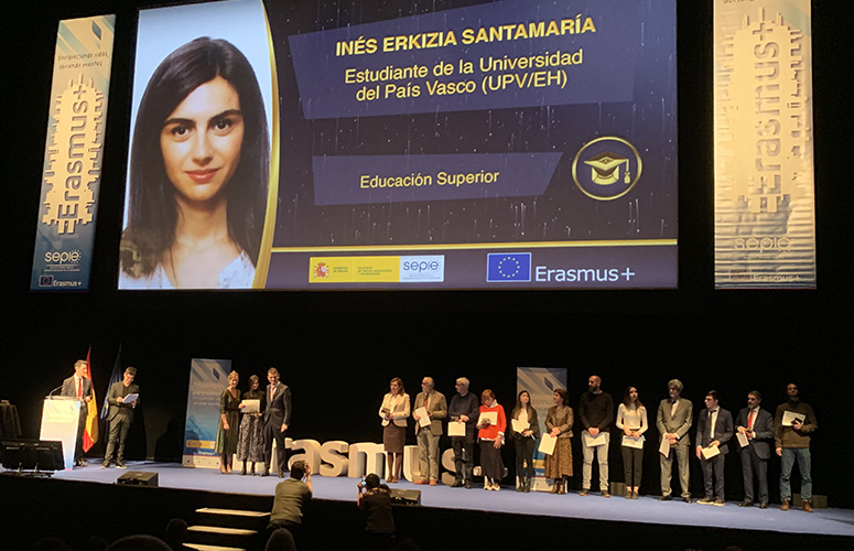 Ines Erkizia UPV/EHUko ikasleak eskuratu zuen haietako bat, Erasmus+ programaren 2018ko deialdian parte hartu zuten goi mailako hezkuntzako ikasleen atalari zegokiona. Erkizia Farmazian graduatu zen joan den ikasturtean eta orain doktorego aurreko ikertzailea da Farmakologia sailean, UPV/EHUko Medikuntza Fakultatean.