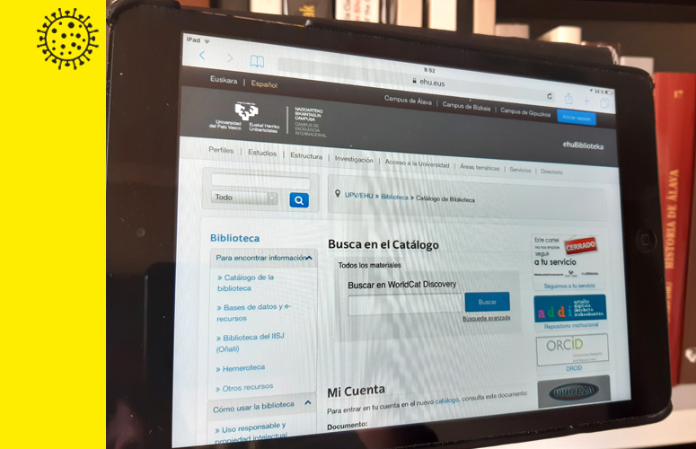 Universidad del País Vasco/Euskal Herriko Unibertsitatean aurrez aurreko jarduera gelditzeak ez du esan nahi Unibertsitate Bibliotekak unibertsitate komunitate osoari zerbitzua emateari utzi dionik. Alderantziz baizik. ‘Itxita dioen kartelak ez digu zure zerbitzuan jarraitzea eragozten’ lelopean, arindu egin ditu baliabideekiko konexioa eta digitalizatutako funts bibliografiko guztietarako sarbidea. Argitalpen horietara guztietara UPV/EHUren Bibliotekaren Katalogoaren bidez sartzen da eta katalogoan identifikatzeko baldintza bakarra da "hasi saioa" botoia sakatzea (orriaren goiko aldean dago, eskuinaldean).