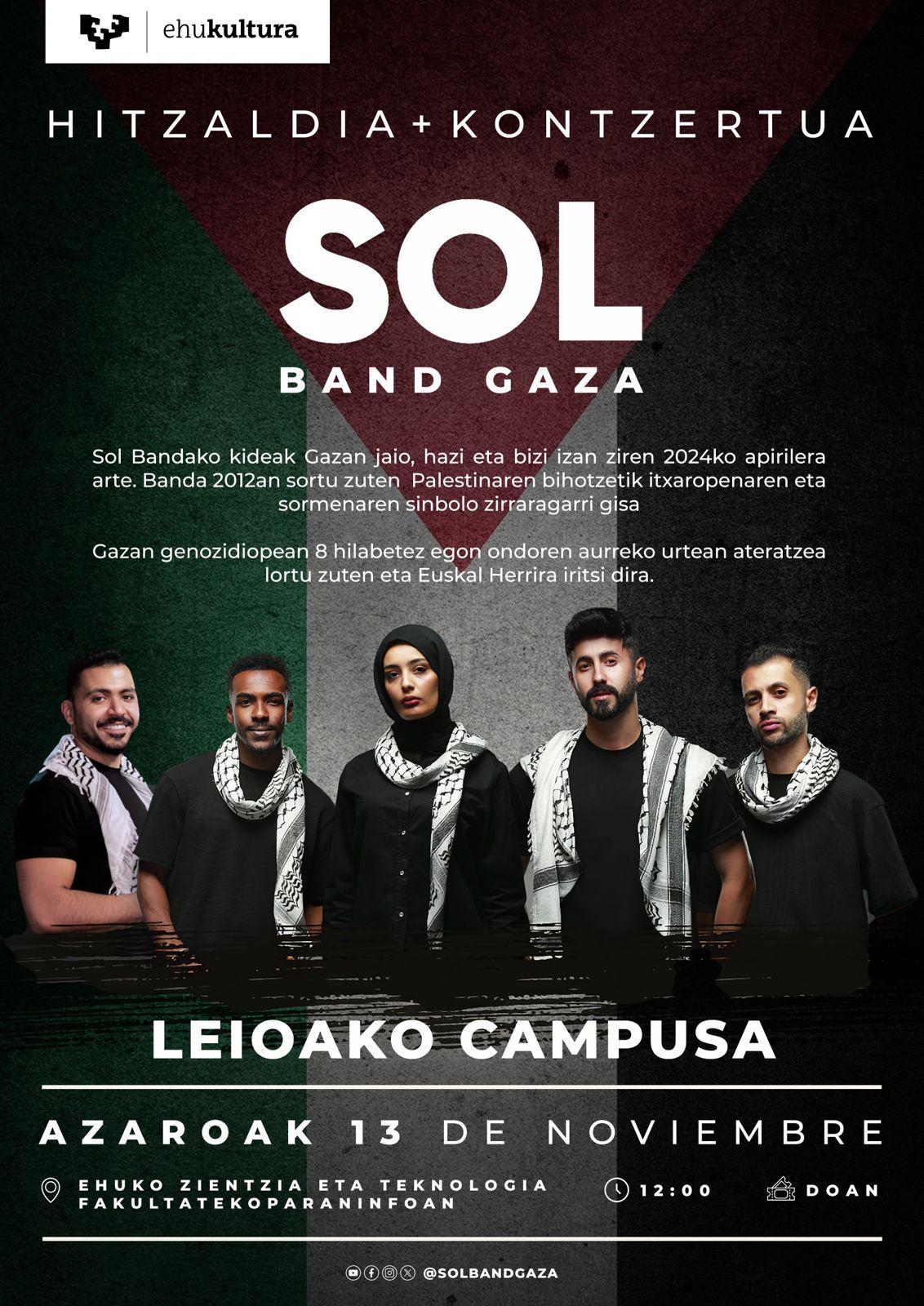 Datorren ostegunean, azaroaren 13an, Euskal Herriko Unibertsitateak (EHU) Sol Band Gaza taldearen kontzertua hartuko du Leioako bere campusean. Palestinar herriaren itxaropen eta erresistentziaren ikur bihurtu den talde hau 2012an sortu zen Gazan, eta bertako kultura garaikidearen adierazpen boteretsuenetako bat bilakatu da.