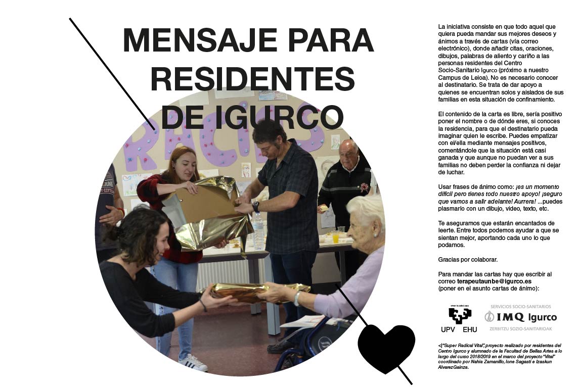 Duela zenbait aste, Izaskun Álvarezek (Marrazketa Saila, Arte Ederren Fakultatea) ekimen bat jarri zuen abian saileko lankide Ione Sagastirekin batera; ekimenaren xedea zen Igurko Unbe egoitzako (IMQ) adineko pertsonen bakardadea arintzea.