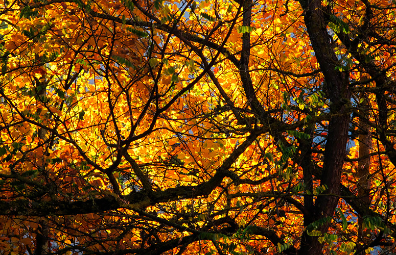 Eguzkiaren izpiek, zuhaitzen adarrez osaturiko bilbadura alderik alde zeharkatuz, zurezko hezurdurak uzten dituzte agerian, udazken koloreez oraindik estalita.
