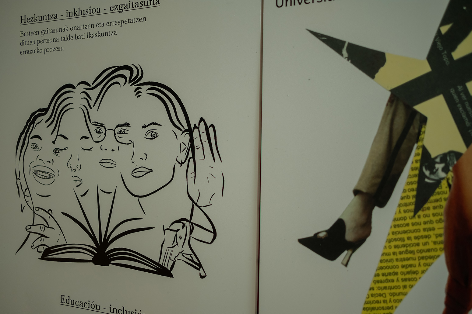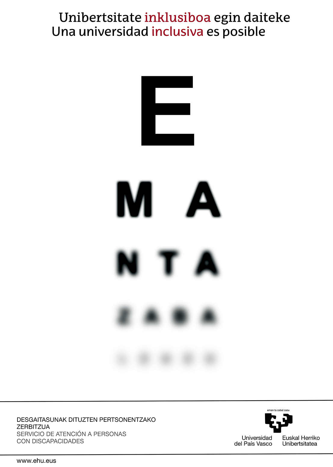 “Kartel bat ikusteko egiten da, eta, nire diseinuaren bidez, kartela ikusten duen oro interpelatuta sentitzea nahi nuen. Testu lausotuak ikusteko desgaitasuna duten pertsonen ikusmena sinbolizatzen du eta, aldi berean, desgaitasuna duten pertsona guztiak irudikatzen ditu. Ikusteko desgaitasuna metafora gisa erabilita, unibertsitateko kideak sentsibilizatu nahi nituen desgaitasuna duten pertsonen inklusioak duen garrantziaren gainean. Izan ere, desgaitasunak ez ditu pertsonak definitzen; haien ingurunea baldintzatu baino ez du egiten. Gure unibertsitateko leloa (‘Eman ta zabal zazu’) erabilita, UPV/EHUk, ezagutzaz gain, funtsezko balioak sustatzen eta zabaltzen dituela transmititu nahi nuen, hala nola inklusioa eta aukera berdintasuna.