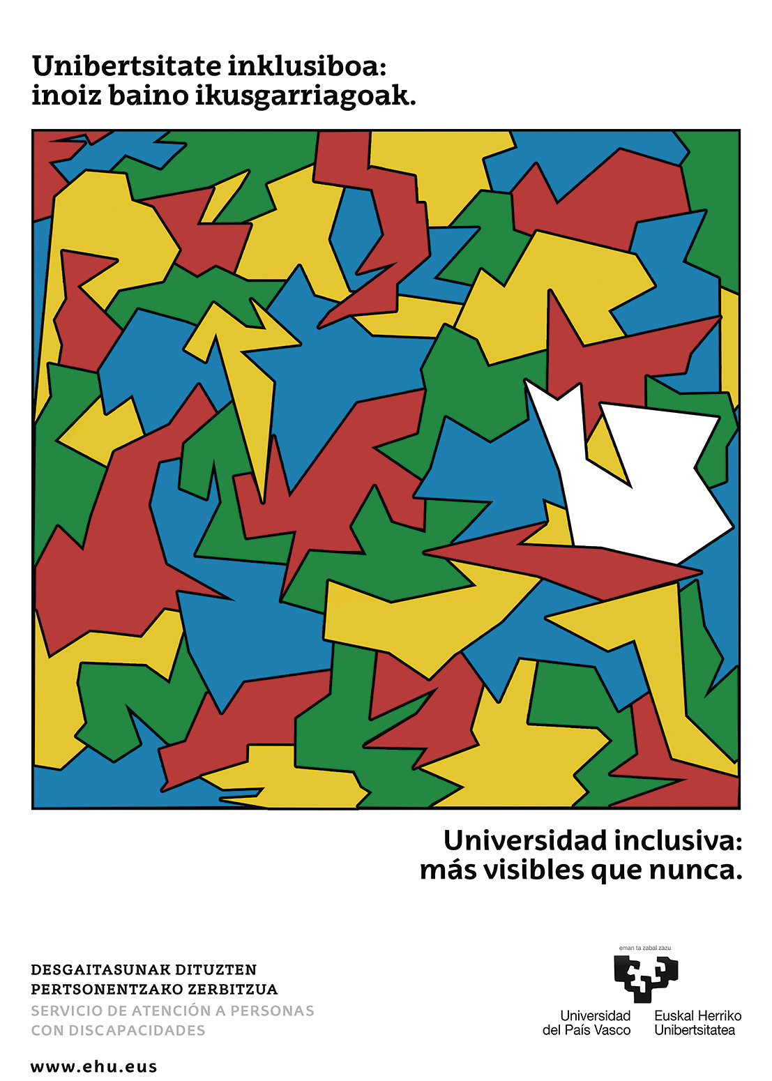 “Desgaitasunak dituzten Pertsonentzako Zerbitzuaren eta kolektiboaren beraren garrantzia bistaratzea da nire kartelaren helburua, irudien bloke bateratu batean hutsune bat irudikatuta. UPV/EHUren gisako erakunde publiko batean horrelako zerbitzu bat izatea zer garrantzitsua den irudikatu nahi nuen, eta hortik sortu zen kartelaren ideia. Oso ohituta gaude zerbitzua ikustera eta, hortaz, normalizatuta dugu. Hori dela eta, hutsunearekin jolastu nahi izan nuen haren garrantziaz eta existituko ez balitz utziko lukeen hutsuneaz hausnartzeko. Hala, kartel honetan hutsunearen bidez irudikatuta dago unibertsitate inklusiboa, batasun solido eta egituratu bat osatzen duten askotariko irudien nahasketa batean. Falta denean ikusten da gehien. Hortik dator lanaren izenburua eta bertan ageri den titularra: ‘Inoiz baino ikusgarriagoak’.