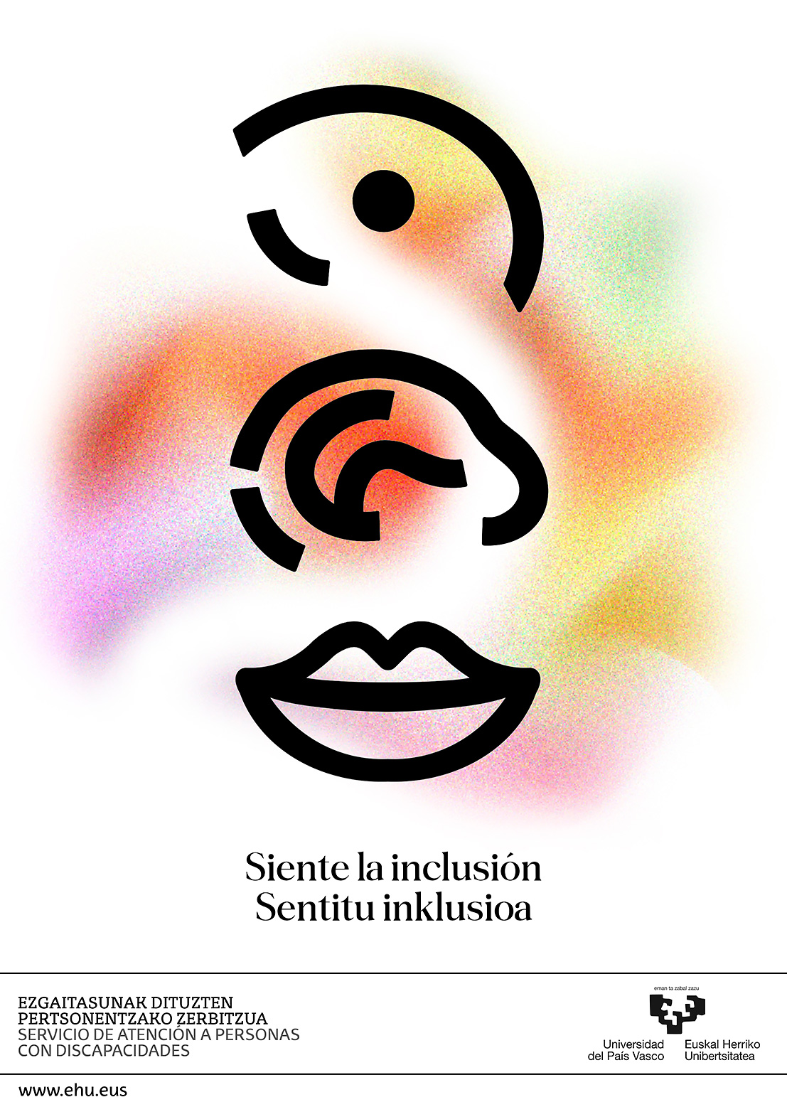 “Kartelean hiru sinbolo ageri dira: begi bat, ezpain batzuk eta belarri bat. Komunikazioa eta pertzepzioa sinbolizatzen dituzte horiek. Hala, itxuratik harago begiratu eta esperientzien eta ikuspegien aniztasuna ezagutzera gonbidatzen gaituzte. Desgaitasuna duten pertsonek aurre egin beharreko esperientzien eta erronken aniztasuna islatzen dute hondoko askotariko kolore biziek. Laino moduko horrek iradokitzen du desgaitasuna ez dela estatikoa eta ez dutela muga zurrunek definitzen. Aldiz, malgua eta aldakorra da. “Sentitu inklusioa” leloaren bidez, pertsona guztiak onartzea eta baloratzea sustatzen du kartelak. Hala, pertsona guztiak modu berean onartzen eta baloratzen diren mundu inklusibo baten garrantziarekin konektatzera gonbidatzen gaitu, emozioen bidez.