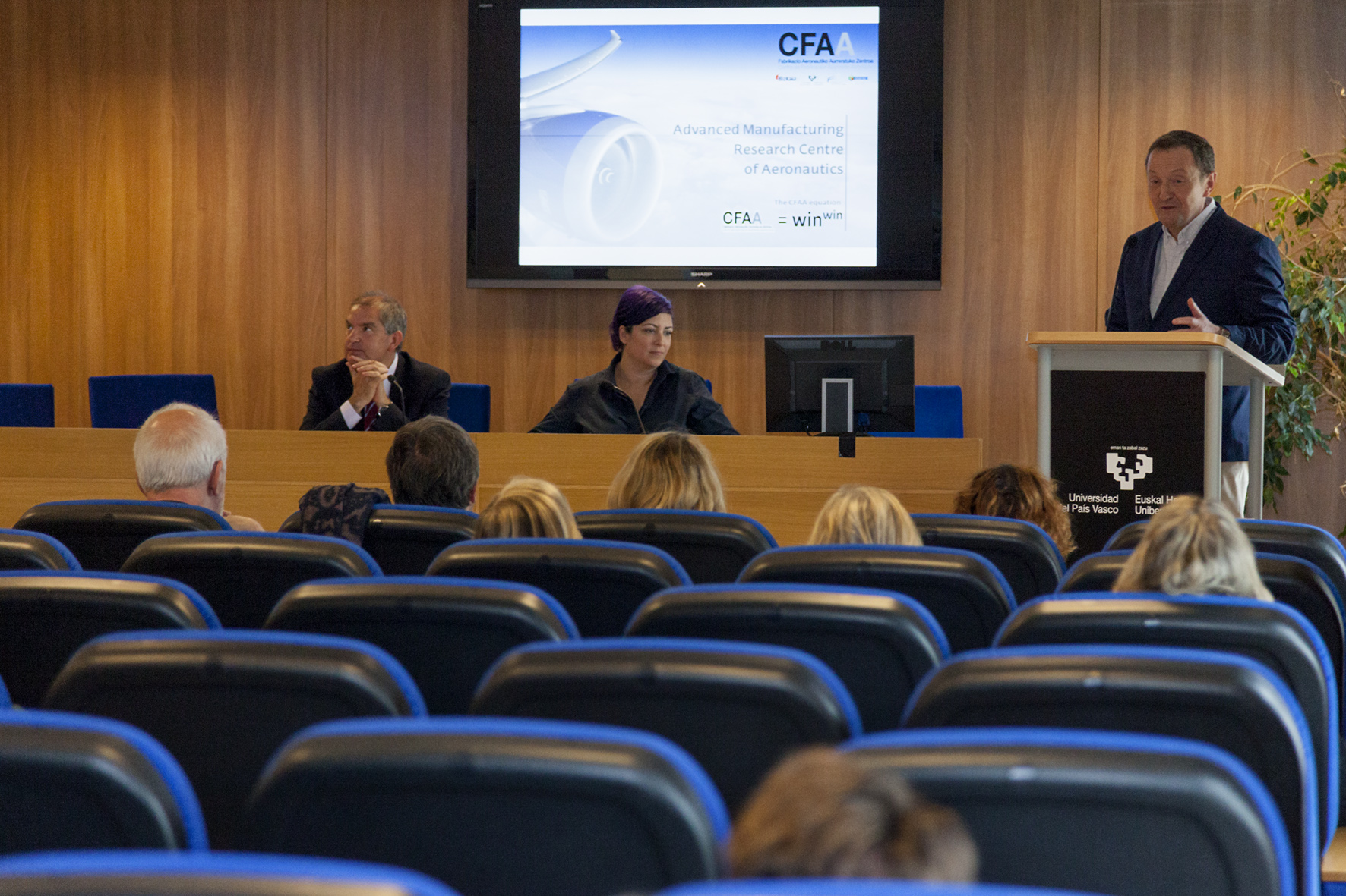 Zazpi ordezkariak Aeronautikako Fabrikazio Aurreratuko Zentroko (AFAZeko) Norberto López de la Calle zuzendariaren aurkezpenak entzun zituzten. Tere Ormazabal (UPV/EHU). -