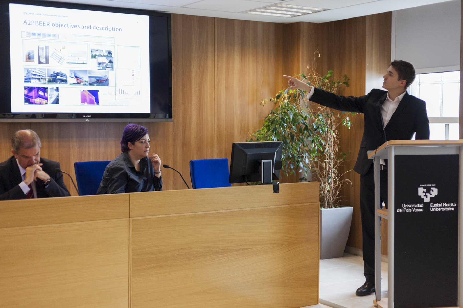 Ione Isasak, UPV/EHUko Europar Programen teknikariak, azaldu zien europar proiektuek garrantzia handia dutela Unibertsitateko ikerkuntzan. Hala, A2PBEER Errektoregoko eraikin proiektuari buruzko azalpenak entzun zituzten, Aitor Ercoreca González Bilboko Ingeniaritza Eskolako irakasleak emandakora.