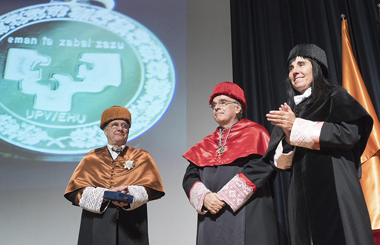 Nekane Balluerkak Urrezko Domina eman dio Andres Urrutiari. Argazkia: Mitxi. UPV/EHU. -