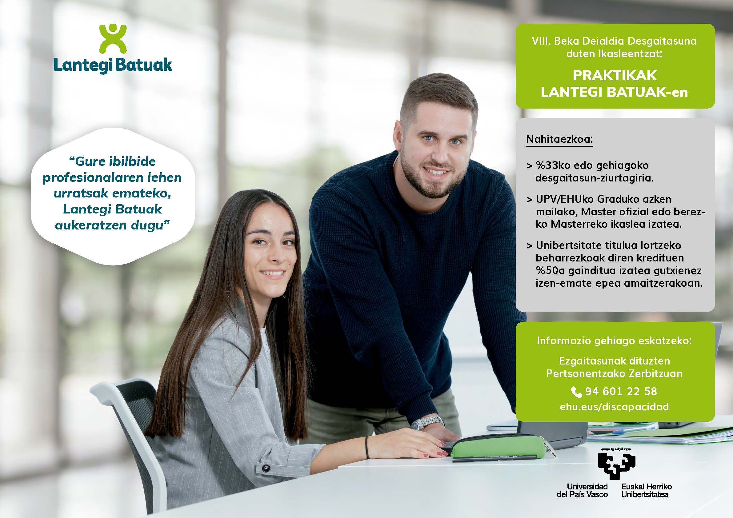 Desgaitasuna duten UPV/EHUko ikasleentzako beka deialdia. Lantegi Batuak-en praktikak