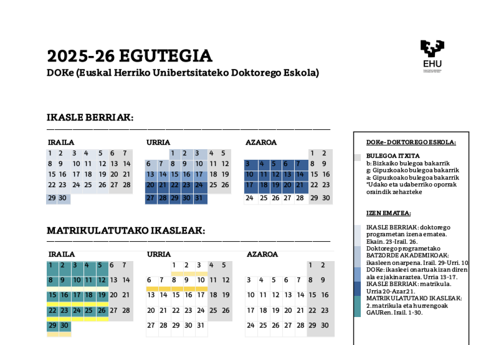 | DOKeko IDAZKARITZA: | Doktorego Eskolaren egutegiak eta jendaurreko ordutegia. | https://www.ehu.eus/eu/web/doktorego-eskola/egutegia-eta-jendaurreko-ordutegiak |