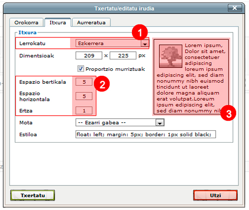 Koadro horri esker, irudi bat txertatu ahal izango dugu paragrafo batean, ezkerreko zein eskuineko kantoian. Eta bestelako aukera batzuk ere izango ditugu; esate baterako, ertzak, marjinak... Hurrengo irudian aukeraketa hauek egin dira: 1) Lerrokatzea ezkerrera, 2) 5 pixeleko espazioa eta 1 pixeleko ertza. Eskuineko laukian, aurrebista bat ikus dezakegu (3). Horrela, irudia paragrafoaren hasieran badago, paragrafoaren testuak irudia inguratuko du.
