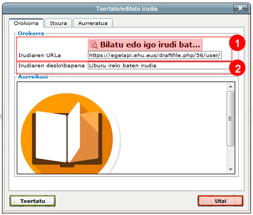 “Txertatu/editatu irudia” botoia sakatzean, hiru erlaitzeko elkarrizketa koadro bat irekitzen da. Ikus elkarrizketa koadroa hurrengo irudian: