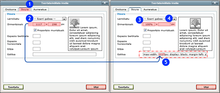 Horrez gain, “dimentsioak” eta “estiloak” eremuak modu konbinatuan erabil ditzakegu, irudia horizontalki zentratuta egon dadin eta hura daukan orriaren eremuaren espazioarekiko proportzionala den espazio bat okupatu dezan, baina inoiz ez irudiaren egiazko zabalera baino handiagoa.
