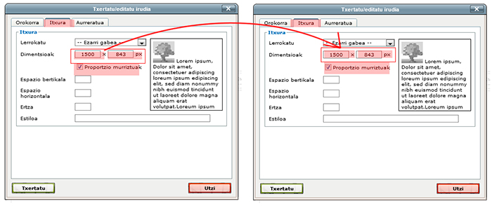 Interesgarria izan daiteke, halaber, irudiaren tamaina aldatzea. Lehenik eta behin, eta kontuan hartuta eGela / eGelaPI orri batean irudi batek nekez bete dezakeela 1000 px-etik gorako espazio bat, haren tamaina murriztu dezakegu argitaratu aurretik, kanpo ediziorako tresna bat erabilita. Aukera hori hautatzen ez badugu, irudiaren zabalera egokitu dezakegu, “Blokeatu itxura erlazioa” aukera markatuta edukiz.