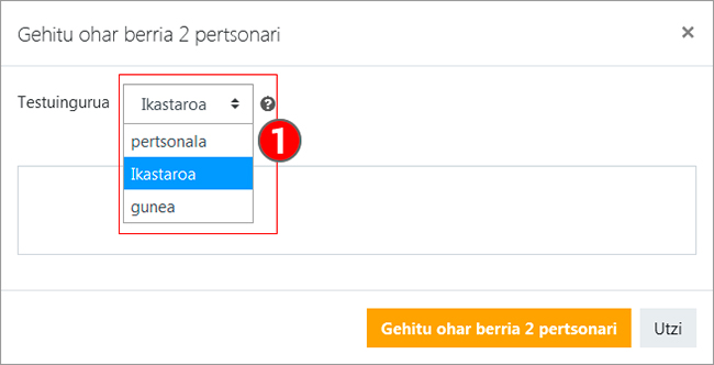 Bigarren aukerak, "Gehitu ohar berria” (2), erabiltzailearen profilean gordeko den testu-ohar bat gehitzeko aukera ematen du. Garrantzitsua da nabarmentzea oharrek hiru ikuspen-maila edo testuinguru izan ditzaketela (1, hurrengo irudian)