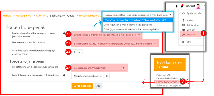 Sartzeko, sakatu "Aukerak" (1) erabiltzailearen menuan eta, orrialde honetako "Erabiltzailearen kontua" atalean, "Foroen hobespenak" (2). Honako aukera hauek ezar daitezke: