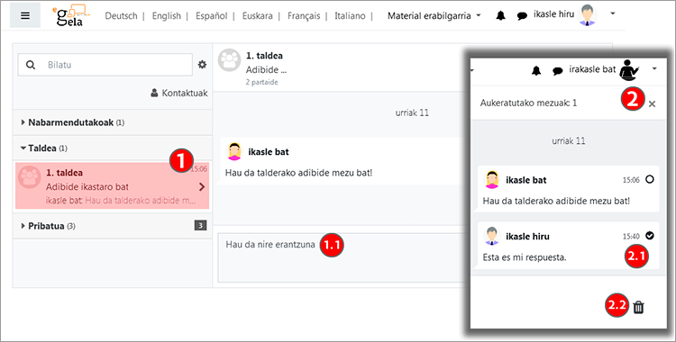 Irakasle-rola duen erabiltzaile bat (2) talde batean sartzen bada (1), elkarrizketa hau (1.1) ere ikusiko du mezularitza-panelean. Ikasleek bidalitako mezuak aukeratu (2.1) eta ezabatu (2.2) ahal izango ditu, egoki baderitzo.