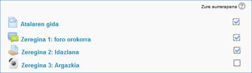 Bigarren edo hirugarren aukera markatuz gero, ikastaroko orrialde nagusian dagokion baliabide edo jarduerarekin lotura duen laukitxoa azaltzen da.